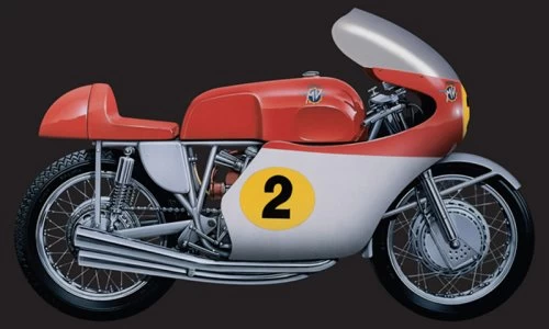 This Cardan-transmission motorcycle, first built in 1950, reached a peak of reliability and competitiveness in 1956 when it adopted chain transmission and a telescopic front fork. The 500 cc 4-cylinder MV Agusta was ridden by the worlds most famous racers – J. Surtees, M. Hailwood, G. Hocking and G. Agostini. Thanks to them this near-unbeatable motorcycle dominated the 500 cc category from 1956 to 1965, winning 9 world titles. It continued competing until 1966 when it was retired to make way for a new, lighter, more manageable 3-cylinder motorcycle.The model, pre-moulded in the original colours and with chrome-plated parts, also