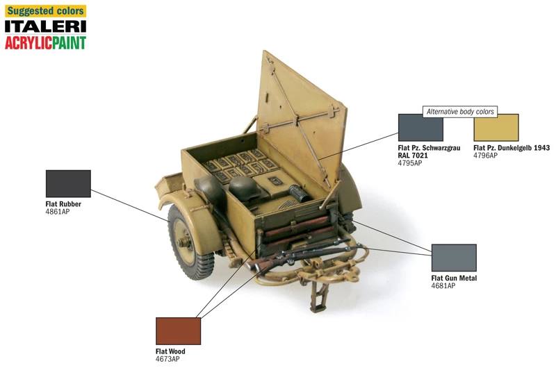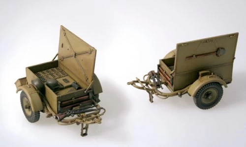 The Sd Anhanger 51 trailer could easily be used by a large number of Wehrmacht vehicles. The trailers have been developed to be used as ammo carriers and they were typically associated to anti-aircraft half-tracks armed with 20 mm Flak guns. During the military campaigns the trailers were often fully loaded with any kind of materials. The lower “U” frame was extremely robust and suitable to be used on road and off road.