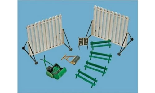 Pack contains 2 laser cut wooden sight screens, score board, lawn mower and roller plus 4 plastic benches. Requires glue and paint to complete.